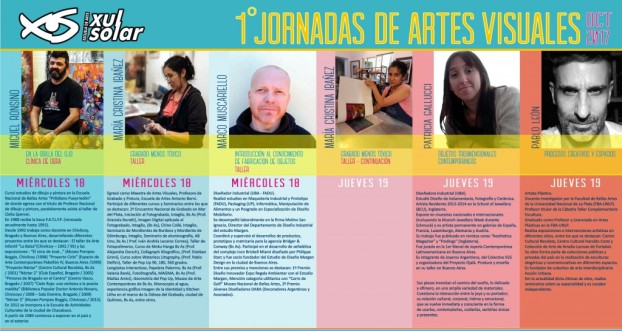 En el marco de las 1º Jornadas de Artes Visuales que se llevarán a cabo durante los días 18 y 19 de octubre en la Escuela de Arte Xul Solar de la ciudad de Junín, son abiertas a todo público para compartir, analizar y re-descubrir nuevas y diferentes miradas como también técnicas y procesos de trabajo en las artes plásticas, donde se expondrán los siguientes temas: Clínica de Obra, a cargo del artista Miguel Ronsino, Taller práctico de Grabado menos tóxico de la mano de María Cristina Ibáñez, Introducción al conocimiento para la fabricación de objetos, abordados por el Diseñador Industrial Marco Muscariello y la artista Patricia Gallucci quien compartirá una mirada desde su obra.