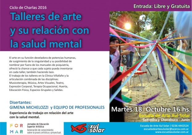 El equipo de profesionales de la Clínica Villafañe acompañados de la coordinadora de talleres Gimena Michelozzi, disertaron en la Escuela de Arte Xul Solar sobre Talleres de Arte en su relación con la Salud Mental.