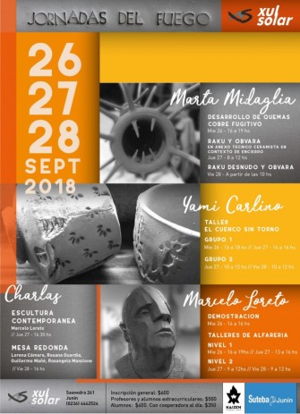 Como todos los años, la Escuela de Arte Xul Solar a través de la Carrera de Cerámica organizan las Jornadas del Fuego, donde los referentes del barro trabajan y comparten sus metodologías y técnicas de trabajo en unas jornadas didácticas con un enriquecimiento constante entre todos los artistas, alumnos y público en general.